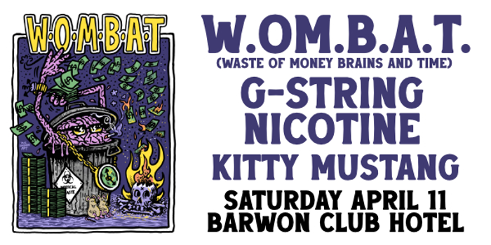 Bad Batch Zine Presents a blistering night of Aussie Rock ‘n’ Roll in the BC Bandroom, Saturday 11th April, 2026 featuring W.O.M.B.A.T + G-String Nicotine + Kitty Mustang. Melbourne’s (W.O.M.B.A.T) Waste of Money, Brains and Time deliver a chaotic mix of rock ‘n’ roll swagger and punk energy, balancing rough-edged guitars with surprisingly catchy hooks. Their debut EP Inbrace introduced a fast, guitar-driven style shaped by the contemporary Melbourne rock and punk scene. On stage, W.O.M.B.A.T bring a loud, loose, high-energy show built around big riffs, attitude and a sense that anything could happen next. Geelong outfit G-String Nicotine specialise in loud, distorted rock that leans heavily into a punk attitude delivering a solid stage presence and tongue-in-cheek stage aesthetic. The band are building an ever growing fanbase developing some original tunes to go with their blistering cover set. Fronted by the charismatic Kitty (Saskia), Kitty Mustang fuse indie rock attitude with grooves pulled from jazz-fusion, classic rock and modern alternative influences. Their sound moves easily between tight rhythm sections, melodic guitar lines and a cool, groove-driven feel with a live performance that stands out in the Melbourne indie scene. This will be a ripper night of Oz Rock at The BC for a very special Bad Batch Zine Celebration! Presale Tix $20 + b/f / Door $25 Doors 7:30pm