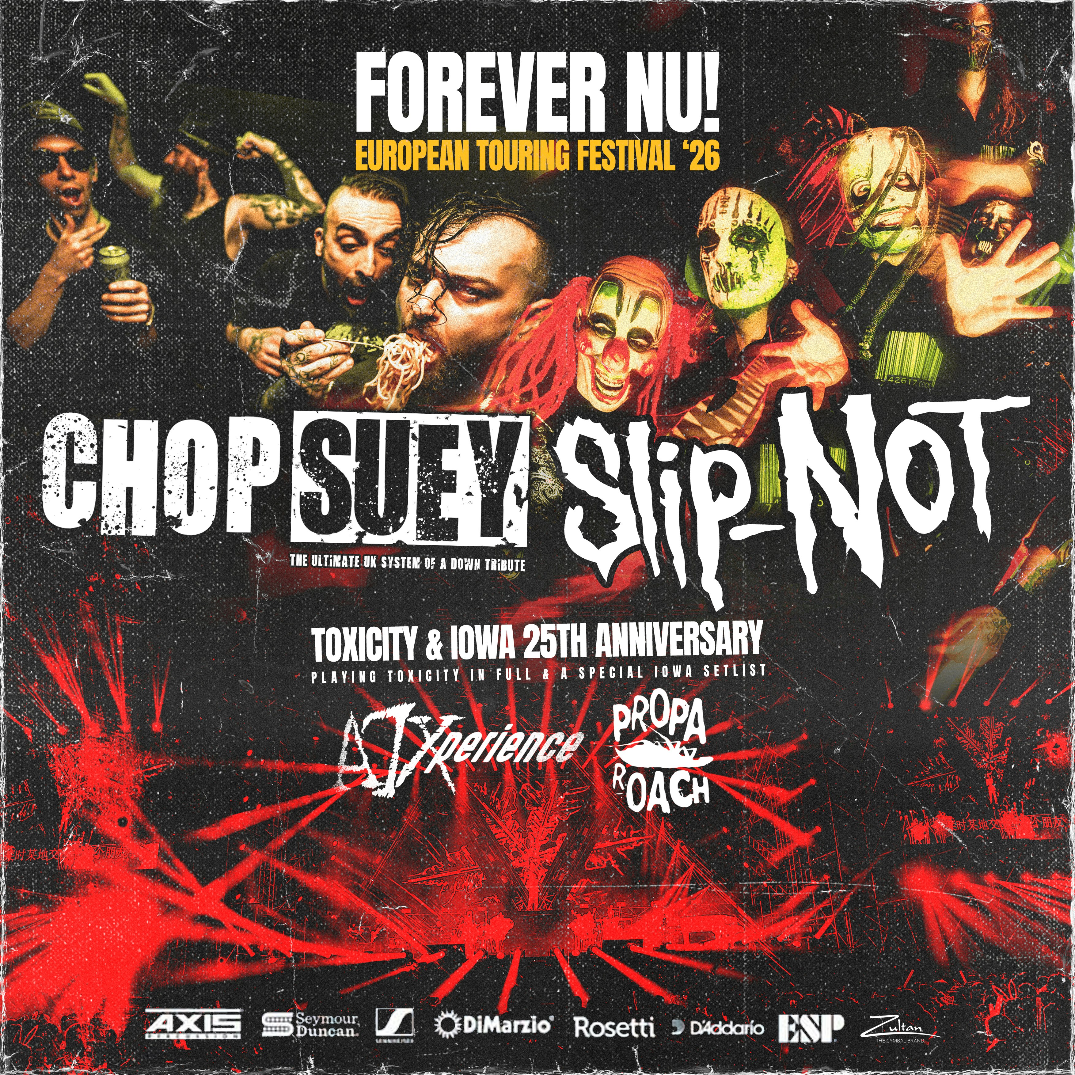 FOREVER NU - 25th anniversary of Toxicity & IOWA special! Chop Suey, Slip-Not, A7Xperience, Propa Roach Featuring members of Dragonforce, Anti-Nowhere League, Tigertailz and Sinsaenum, Chop Suey and Slip-NOT have cemented themselves as two of the best tribute acts in the UK! This year they are bringing a special show to a city near you, celebrating the 25th anniversary of two of the most iconic metal albums of a generation! Joined by A7Xperience and Propa Roach, this is a night not to miss for fans of 00s metal! Come and join the party, and see for yourself just how good a tribute show can be!