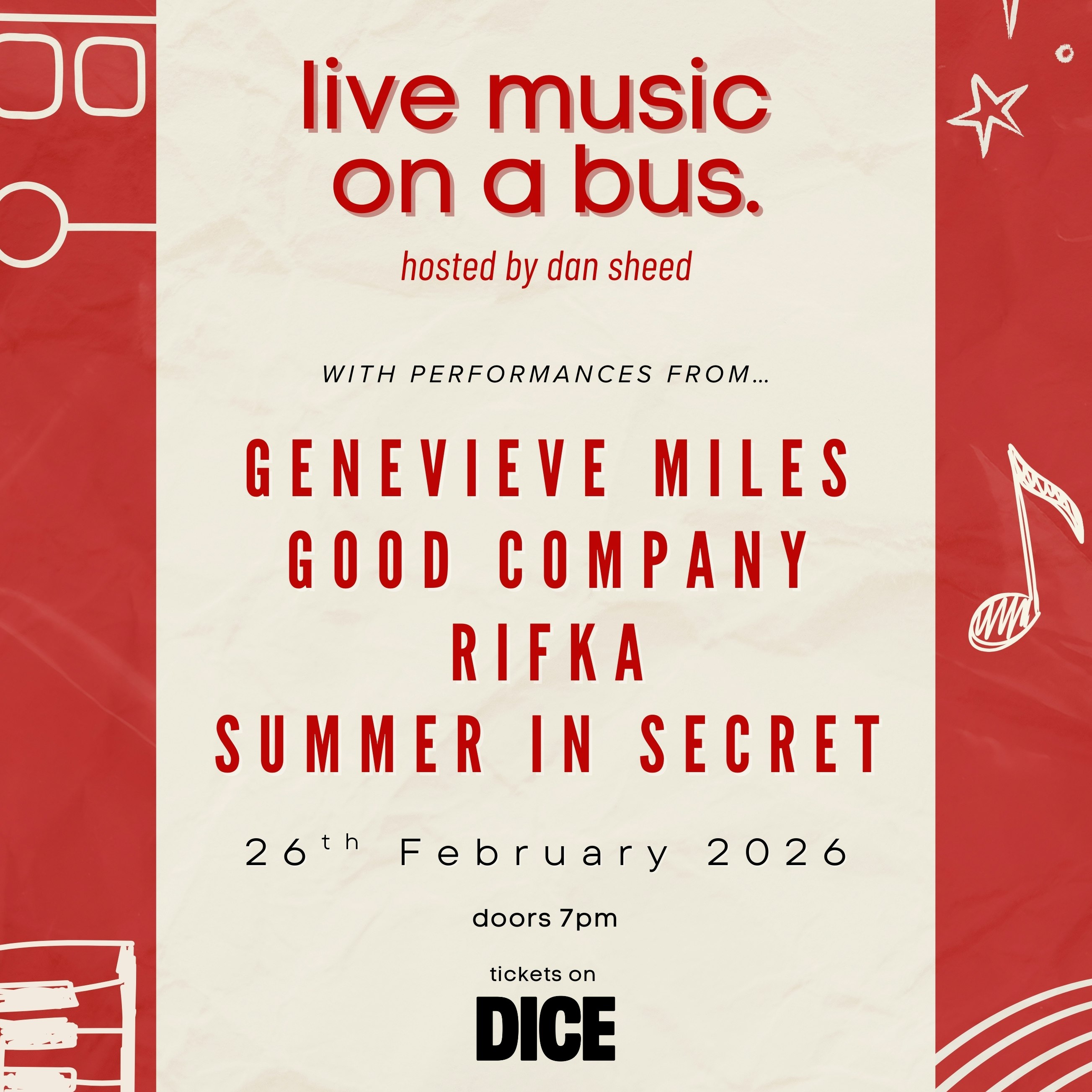 Fancy seeing some live music on a double decker bus? Music tastemaker Dan Sheed of Turtle Tempo has you covered. Join us in Wood Green for live music from 4 unique artists in Genevieve Miles, Good Company, Rifka & Summer in Secret. Please arrive within good time. Hop on board from 7pm!