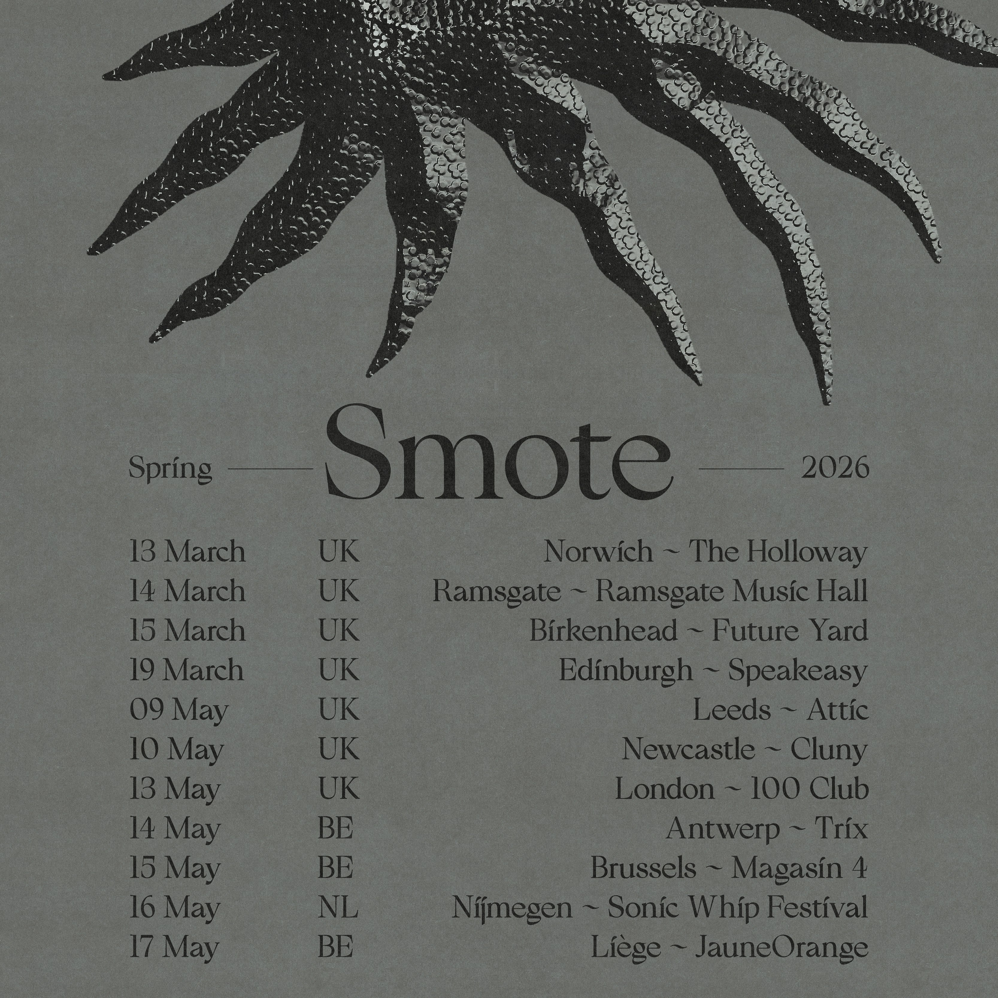 SMOTE, once a solo endeavor by Daniel Foggin, now expanded to a fuller ensemble blends traditional instrumentation — creaking strings, funeral drums, somber winds — with thunderous synth work and desolate guitar to craft drone and dirge.