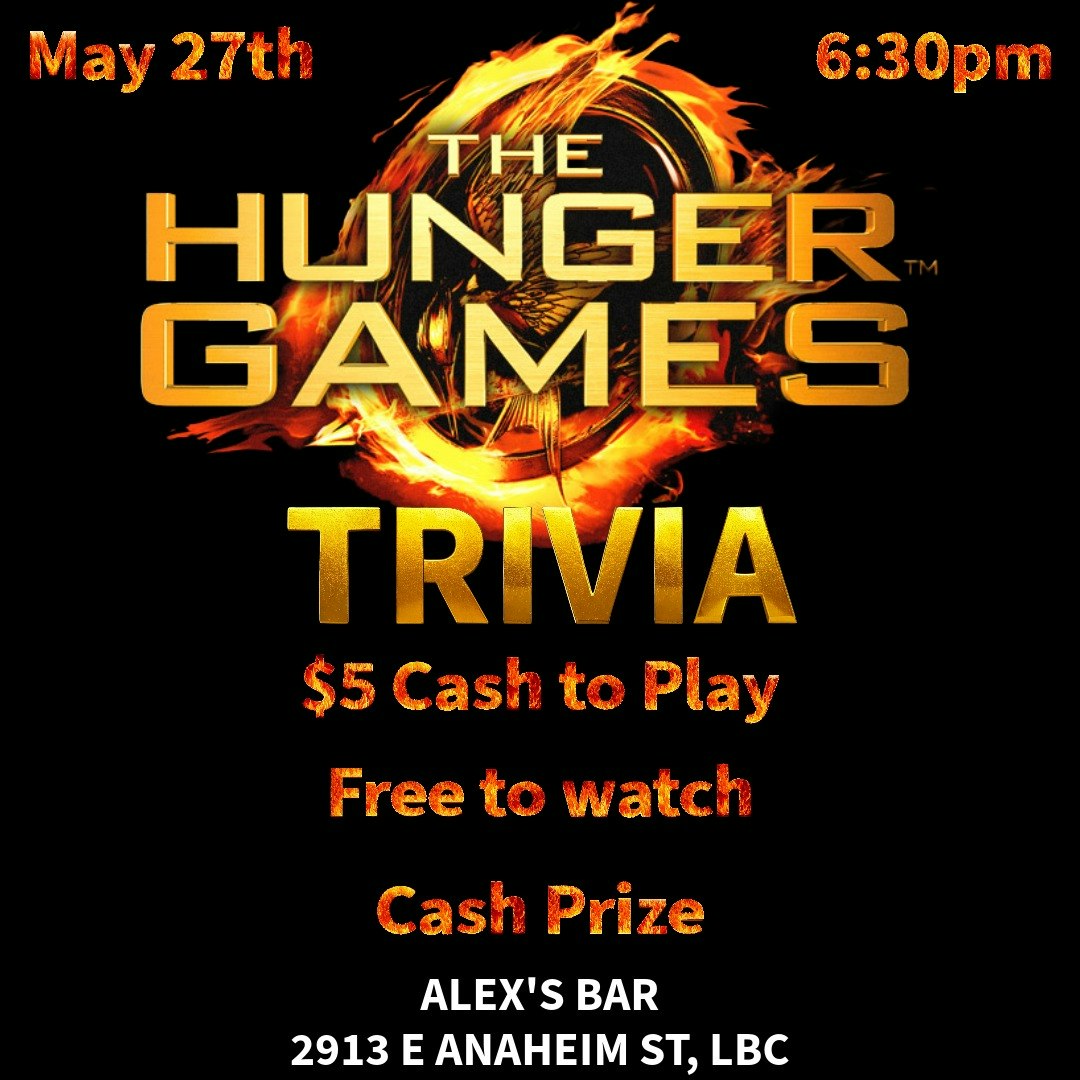 Test your knowledge on THE HUNGER GAMES! Books and movies...all of it! This will reach capacity so get here early $5 cash per person, teams of 2-6 people Sign Ups start at 6:30pm Cash Grand Prize Costumes highly encouraged! Hosted By Phil and Esther