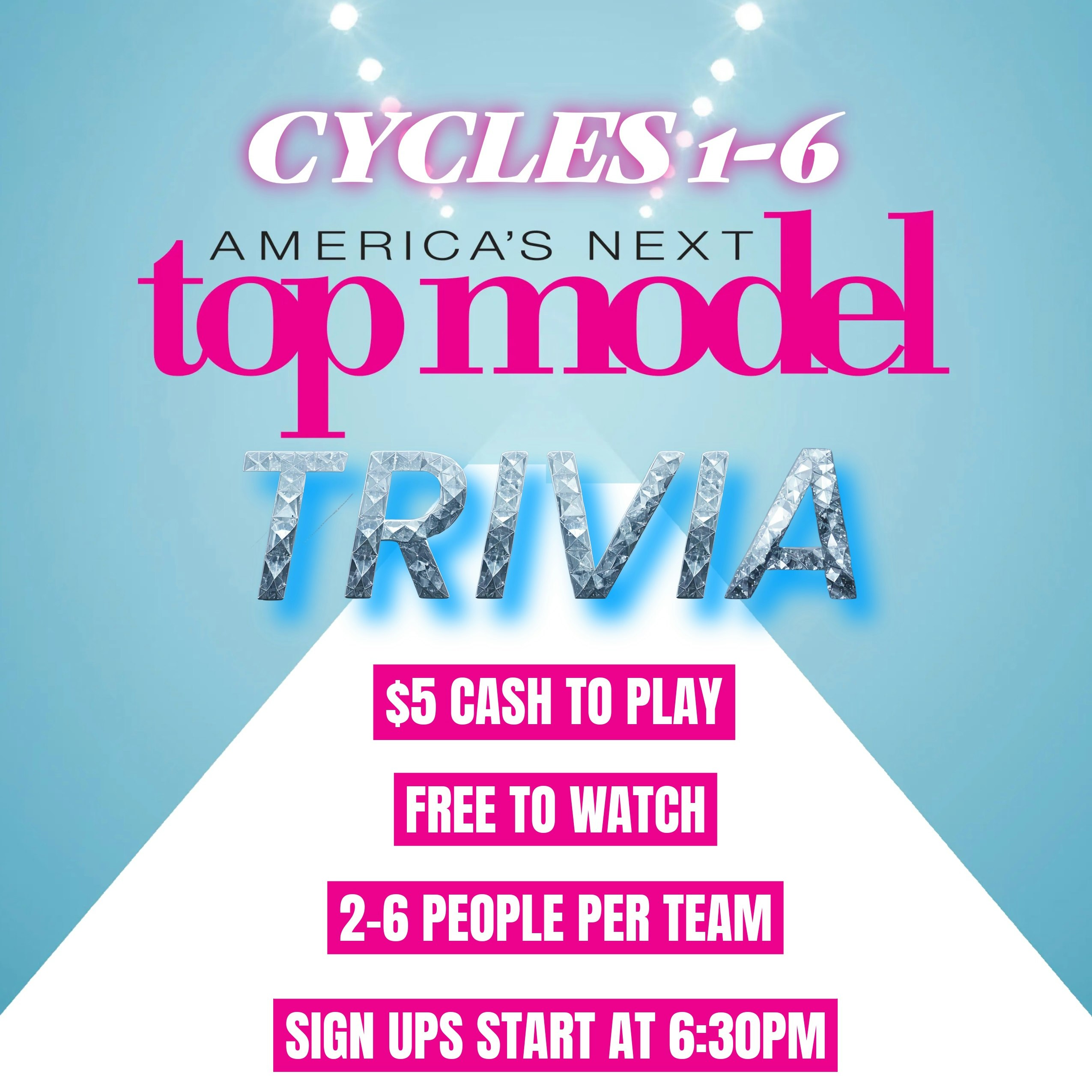 Test your knowledge on ANTM cycles 1-6! We know you like drama, but do you like like drama? This will reach capacity so get here early $5 cash per person, teams of 2-6 people Sign Ups start at 6:30pm Cash Grand Prize Runway walk competition! Hosted By Phil and Esther