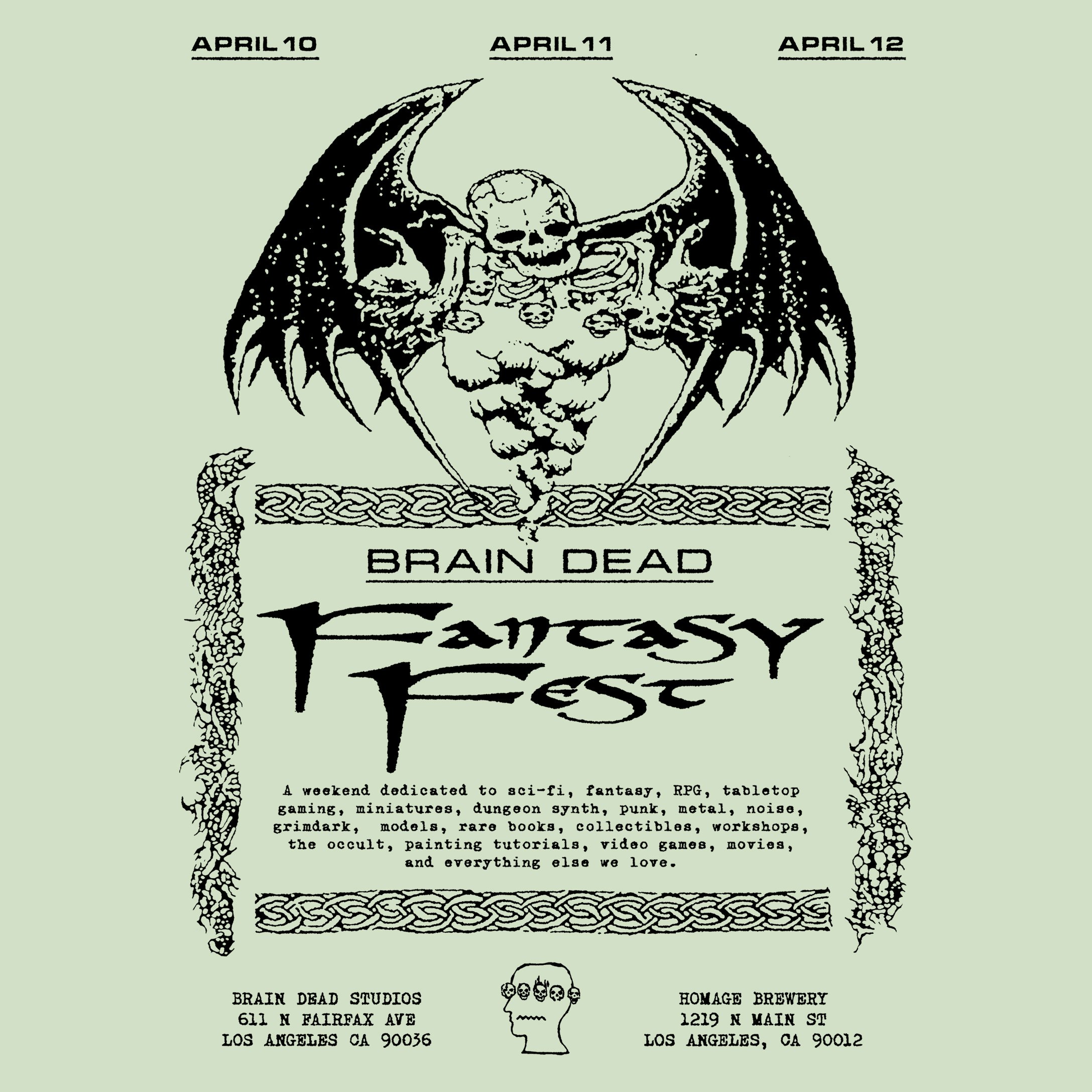APRIL 10 • 11 • 12 A weekend dedicated to sci-fi, fantasy, RPG, tabletop gaming, miniatures, dungeon synth, extreme music, grimdark, models, rare books, collectibles, workshops, the occult, painting tutorials, video games, movies and everything else we love. Get your early bird access ticket to a full weekend of programming across Homage Brewing and Brain Dead Studios, including: – Vendor Marketplace – Movie Screenings – Game Play/ Tournament Opportunities – Live Music – Workshops, Tutorials, and More – Exclusive Products This weekend is a celebration of our community that we love. We want to also give back to our extended community during these hard times. $5 from every ticket will be donated to CHIRLA, California’s largest immigrant rights organization. Event calendar, exclusive merch, more vendors, special tournaments, movie screenings, video game events, music acts, and guest appearances TBA over the next two weeks. Dont miss out on the early bird ticket price! BRAIN DEAD FILM CLUB MEMBERS get 10% off tickets, priority sign ups for events and activities, and 10% off Brain Dead merchandise using your member number.