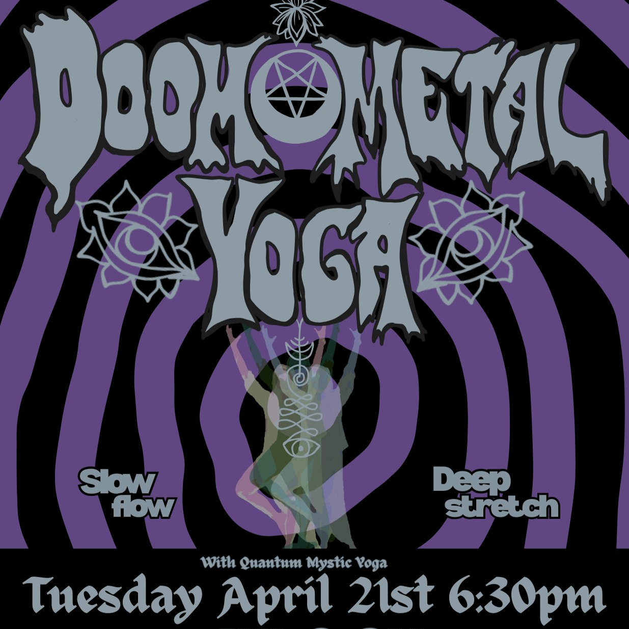 Doom Metal Yoga by Quantum Mystic - Tuesday 4/21 6:30PM Slow & Deep flow edition Doom metal Yoga will be a slower paced yoga class connecting movements with the breath. There will be an emphasis on alignment and cultivating a sense of presence while listening to doom. During the first portion of class we will gently move through a moon flow to warm up the muscles, joints, and fascia. The second half will be filled with longer holding stretches allowing the body to completely relax, before surrendering in corpse pose. Check in begins at 6:00pm where you will sign a waiver and find your spot on the floor. Bring your own mat / All experience levels welcome We will have the lights low so everyone can feel safe practicing at their own pace. Class cost is strictly for class, so we'd love if you hang out after and grab a drink downstairs at Burial beer Quantum Mystic is a licensed instructor that specializes in power yoga