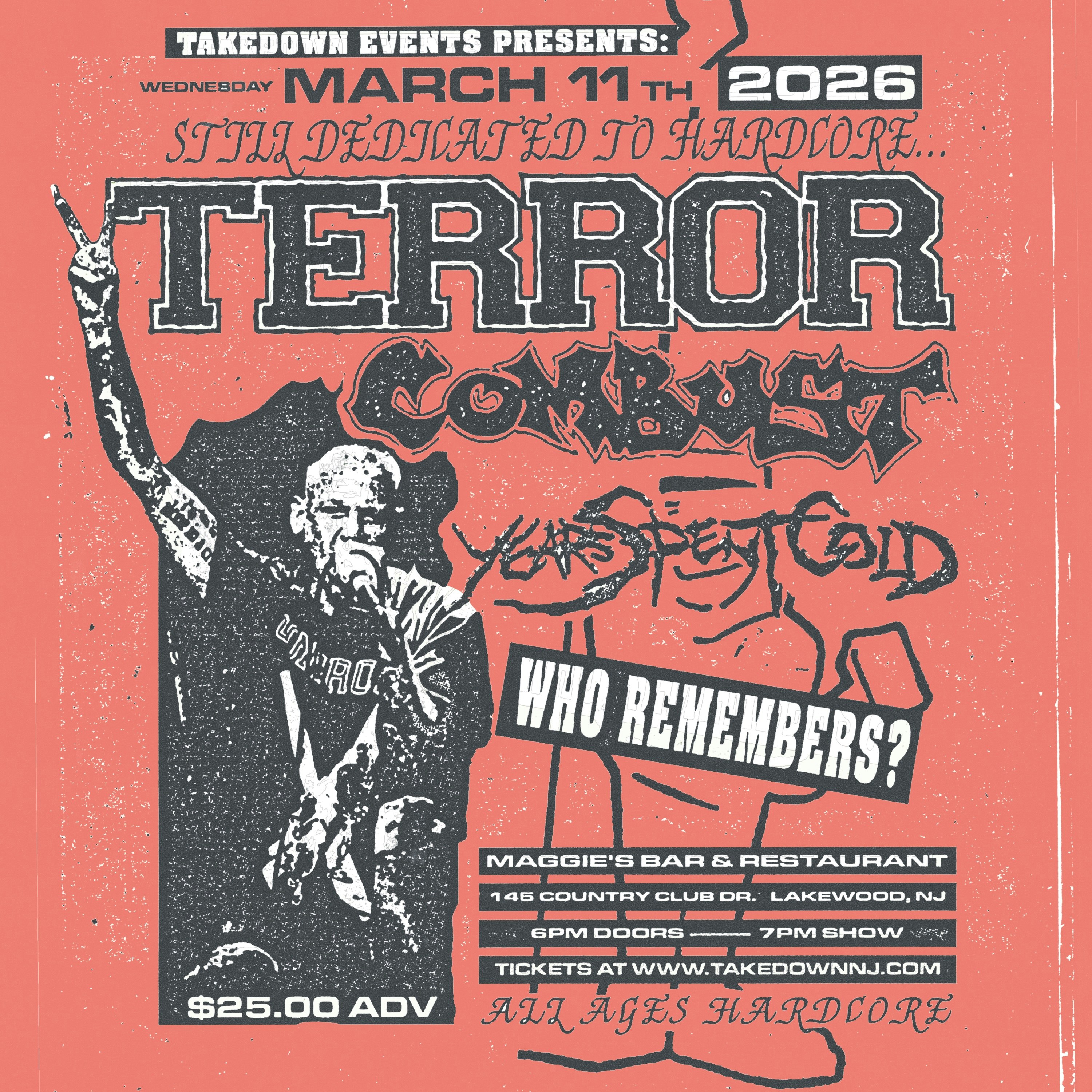 Takedown Events Presents.. Wednesday March 11th, 2026 @ Maggie's Bar & Restaurant 145 Country Club Dr. Lakewood, NJ 08701 6pm Doors // 7pm Show Tickets at https://www.takedownnj.com $25 Adv. // $30 Day of All Ages Terror Combust Years Spent Cold Who Remembers?
