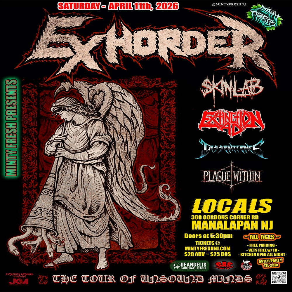 MINTY FRESH PRESENTS: EXHORDER at Locals in Manalapan NJ with support from SKINLAB EXTINCTION AD DISSENTIENCE PLAGUE WITHIN This show is ALL AGES! Doors at 5:30 $20 adv $25 dos