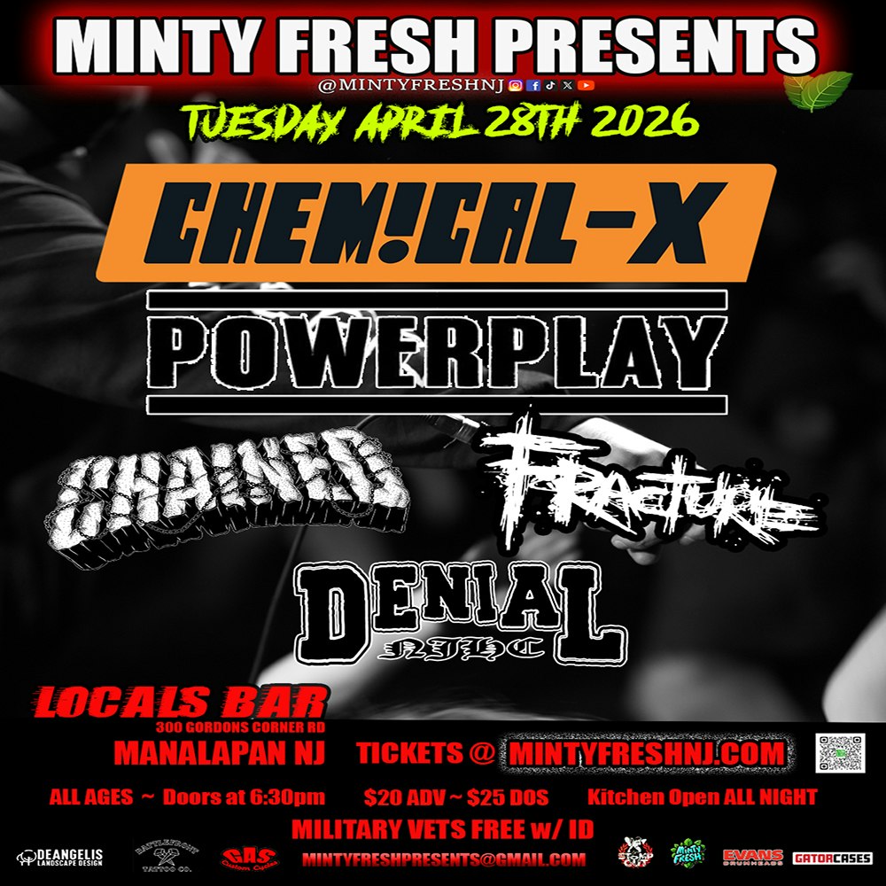 CHEMICAL X POWER PLAY (FL) CHAINED (NC) FRACTURE DENIAL ALL AGES! Doors at 6:30 $20 adv $25 dos