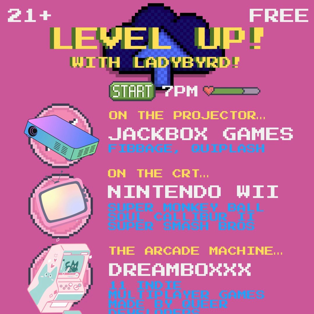 Join LADYBYRD! and friends every Tuesday for free rotating video games - via indie arcade, CRT, and projector. Game, battle, build, & compete in tournaments 👾💌👾