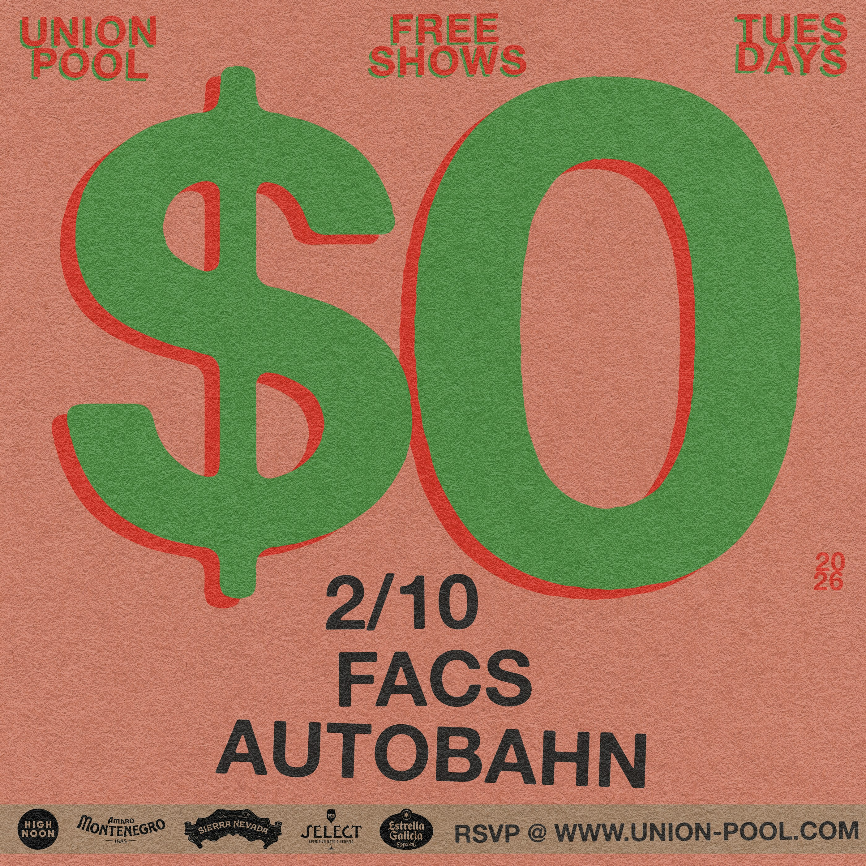 Enjoy a night out with FACS ✷ Autobahn at Union Pool in New York. All shows are free, with entrance based on capacity, first come first served. Discover new music and share events with friends.