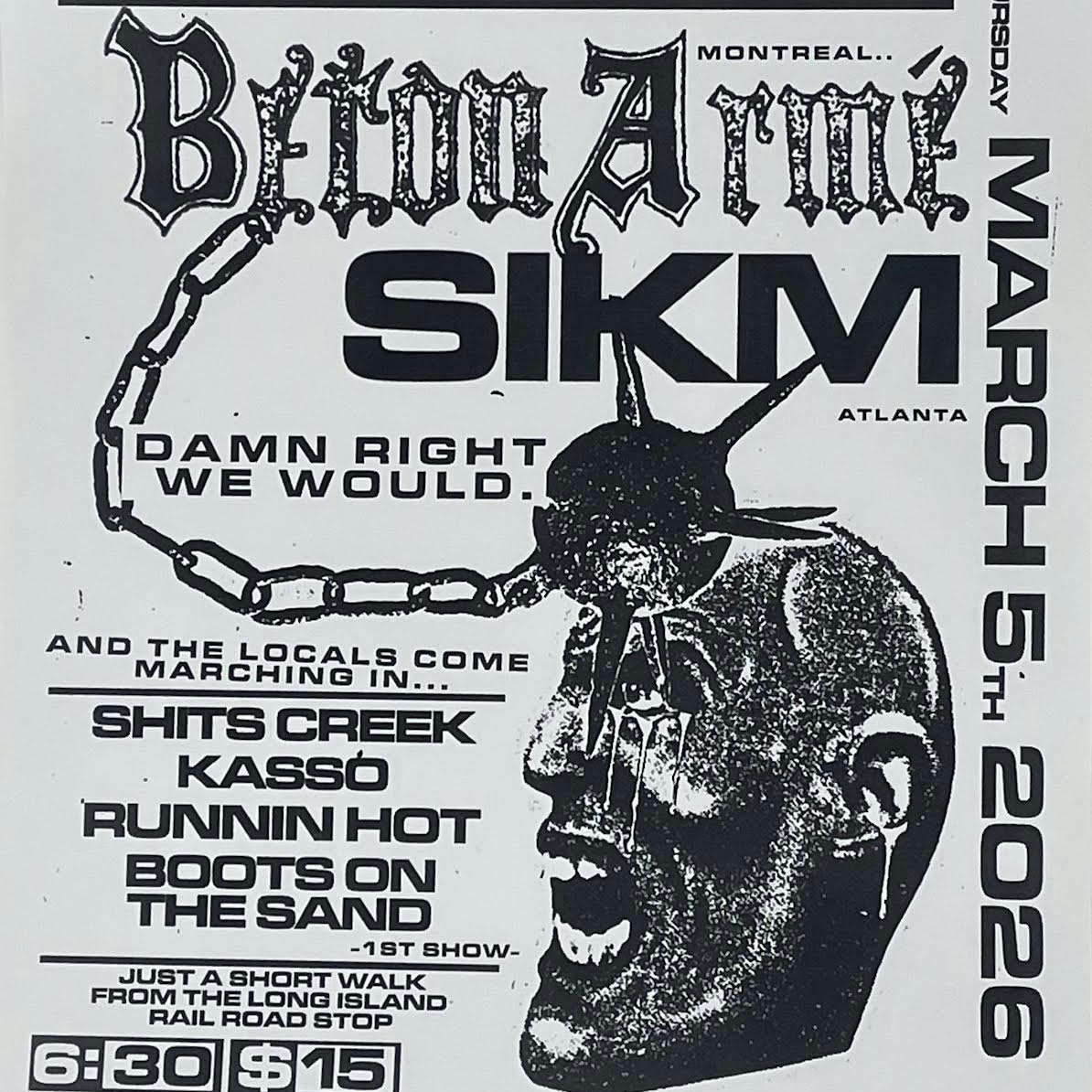 Don't miss Béton Armé, Sikm, Shits Creek, Kasso, and Runnin Hot at Massapequa VFW on March 5th, 2026! This all-ages event, presented by LIHCSHOWS, promises a night of high-energy performances. Doors open at 6:30 PM, show starts sharp at 7 PM. Get your tickets now!