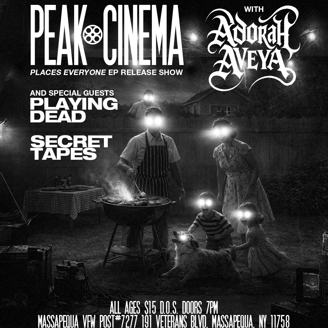 Saturday, May 9th Peak Cinema (EP Release Show) Adorah Aveya Playing Dead Secret Tapes @ Massapequa VFW Hall 191 Veterans Blvd, Massapequa NY 7 PM All Ages $15