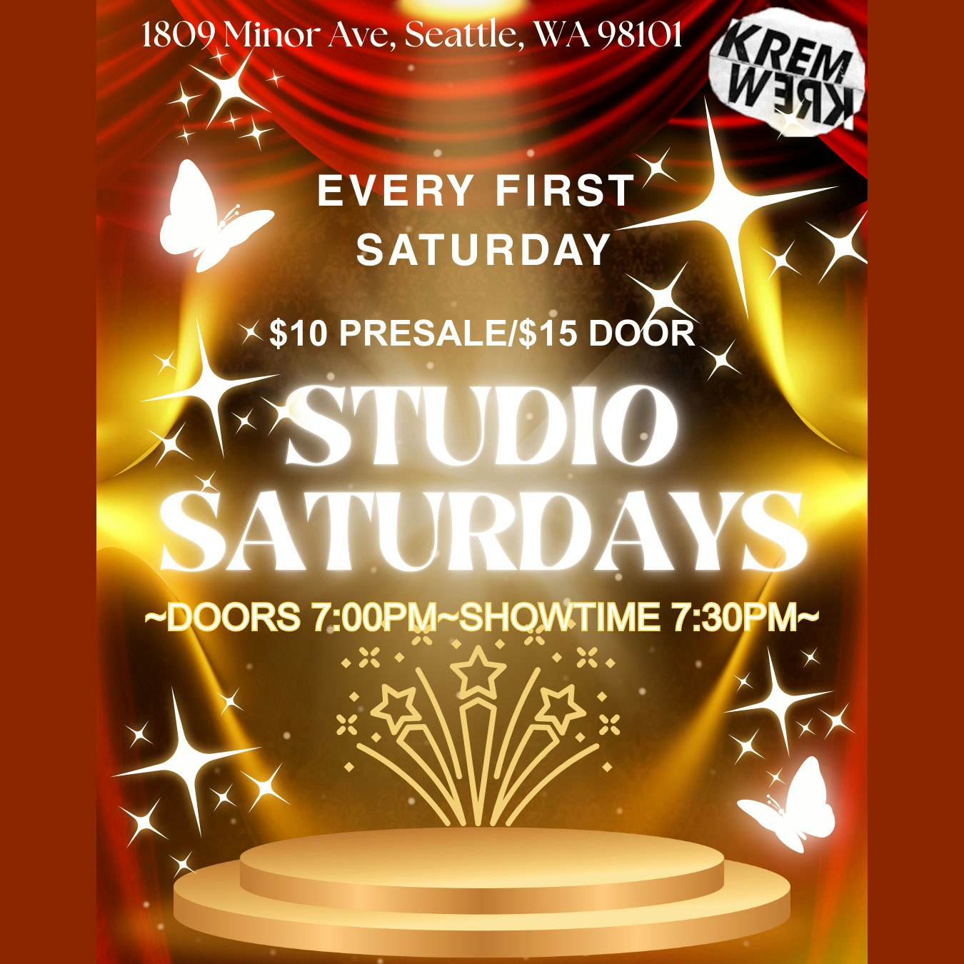Studio Saturdays is an open stage night that welcomes fresh and established performers, locally and afar, to showcase and express the many facets of artistic expression. Come and support an inclusive and entertaining open stage night that is one of a kind every single month. Enjoy drag, comedy, singing, burlesque and more, all art forms are welcome and encouraged. Support our monthly raffle and you know you want to tip these talented artists, so bring a dollar or a few to show your gratitude! Produced & Hosted by King Leo Mane! April Cast: TBA Resident Performers: Flora Pleaze Pam Jobb N. Moore Resident Crew: Your Beautiful Nightmare-Stage Manager Perla Violet-Kitten Saffron-GoGo Kremwerk is currently not an ADA-accessible space. Club entry is through a flight of 12 metal stairs, with two small steps leading into the main part of the club. We have 2 restrooms with a total of 3 stalls and 1 urinal, all gender-neutral.